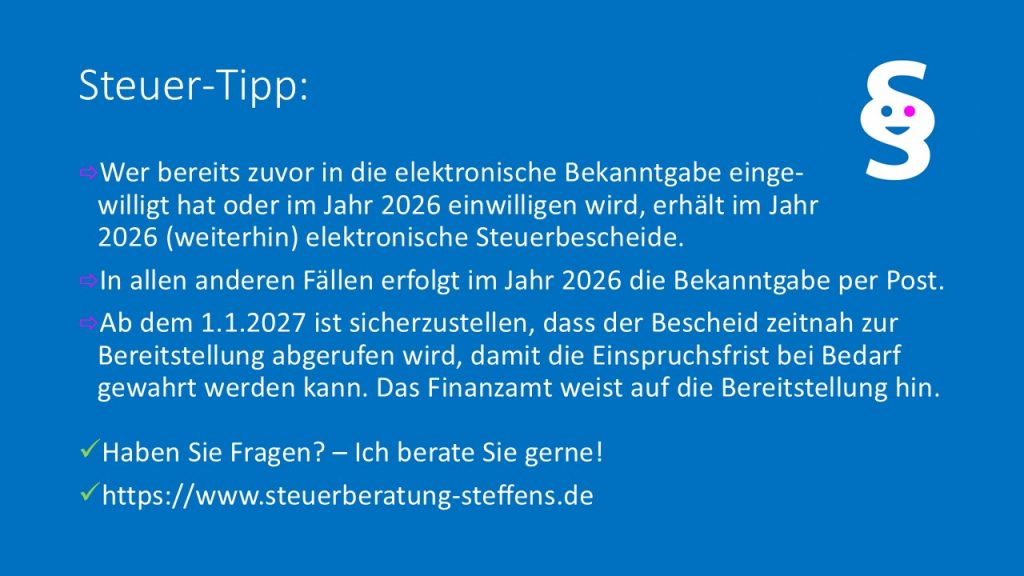 Categories SteuerTipp Tags digitaler Steuerbescheid, elektronische Bekanntgabe Posted on 8.04.20268.04.2026